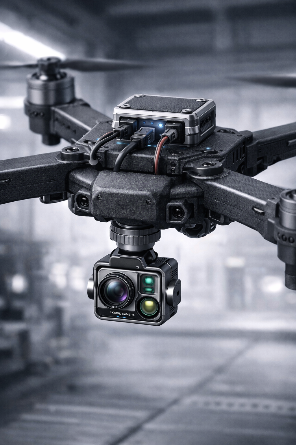 The camera provides the system with visual awareness for enemy detection and obstacle avoidance. It captures video and depth information its surroundings and react safely during autonomous flight.